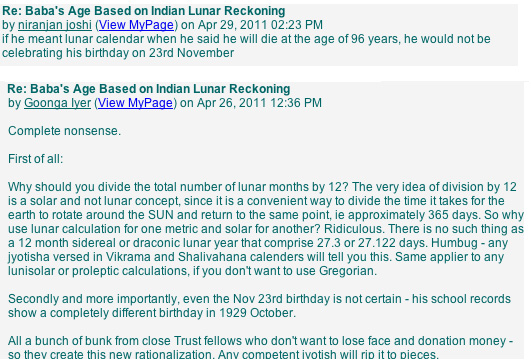 The Sathya Sai Organisation - both centrally and in various countries - claim that he calculated his lifespan in lunar years, not solar (calendar) years. They juggle with various figures and lunar month lengths and try to get his age up to over 90, but none of the calculations agree with their assumption of lunar years. The concept of a 'lunar year' is actually not valid at all in astronomical terms, because a year is by definition the time it takes for the earth to circumnambulate the sun. But 12 lunar months never amounts to a year... so the concept is a non-starter for calculating years at all. But not for Hindu shastris who operate with their own obscure and contorted ideas. They are called in trying to rationalize away the hard fact that Sathya Sai Baba lived for only solar/calendar 84 years, and that he always reckoned in calendar years in every documented word (despite desperate claims that he told other things in private!). Some of the many comments about this 'lunacy' of denial on the Internet are shown in the inset scanned material. See a yet more detailed analysis Sathya Sai Baba 96 years old at death? Lunar year confusions