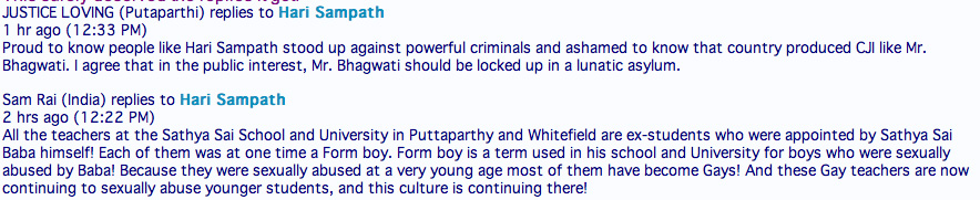 Mr Bhagwati, I have some questions for you, although from your interview I have already got all answers. I had given a formal complaint to the CBI against Sai Baba in March 2001, and moved the Supreme court of India through a Public Interest litigation under article 32 of the constitution ( hope you remember this PIL law as you were the one who initiated it). From your responses it is very clear you have no respect for the law or the constitution, and you clearly state that any man/woman "revered" by millions as divine should not be investigated for any crime. Have you heard of the legal maxim "Justitia non novit patrem nec matrem; solum verrtatem spectat justitia. (Justice knows neither father nor mother; justice looks to the truth alone.), or for that matter "audi alteram partem" ( hear the other side), which are the basic pillars of natural justice ? If you have a case before you with even eyewitnesses who say Sai Baba raped a young boy , and if your judgment is " what is the point of investigation, as I think he is god"...I think you must be locked up in a lunatic asylum. When the whole world is aware of the fact 6 murders took place in Sai Baba's bedroom in June 1993, you- a Sai Baba trust member, who had extensive confabulations with the then home minister SB Chavan to close the case, now claim " I was in Delhi and am not aware of it, I don't know" you must either be delusional or a fraudster. Shame on you Bhagwati, its a national disgrace that you were Chief Justice.
