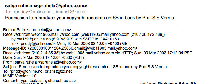 Re: Permission to reproduce your copyright research on SB in book by Prof.S.S.Verma