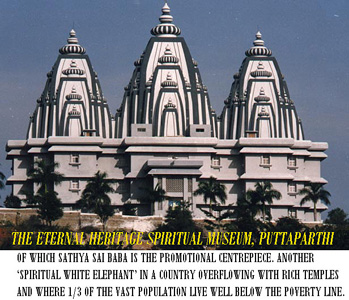 The entire ‘Spiritual Museum’ building construction was contracted by a major Indian firm that has no other connections with the ashram. The structure is a copy of the Somnath temple at Puri, one of the major Hindu temples in India. The central dome-like structure at the top of the central 'spire' lacked, according to one of Sai Baba's own engineers, the necessary reinforcements and it apparently contained too great a mass of concrete for safety. It is said that Sathya Sai Baba himself had very recently warned that it was overweight and would have to be reconstructed, but I do not know to whom (if anyone) he actually said this. Most likely a typical rumour put about by officials to support devotees’ belief that Sai Baba knows everything, and to avert criticism in the interest of damage limitation – seeing that the facts had already leaked out despite their efforts.