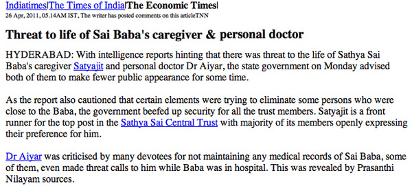 The Times of India reported June 21 under a heading: Sai Baba's niece claims threat to life from Trust members (http://articles.timesofindia.indiatimes.com/2011-06-21/india/29683276_1_eeswaramma-baba-devotees-sai-baba) The article included the following:- “Sources said several family members and relatives are livid at the way the inventory was carried out inside Yajur Mandir. Pointing their fingers at senior Trust member V Srinivasan, they alleged that he was responsible for barring their entry into Yajur Mandir. Shravan, brother of Chetana, demanded a fair probe into the cash seizure muddle and the alleged shifting of valuables and cash from Yajur Mandir. “Police should conduct a thorough probe in this regard as lakh of Baba’s devotees are hurt by the series of allegations involving the Trust,” he said.”