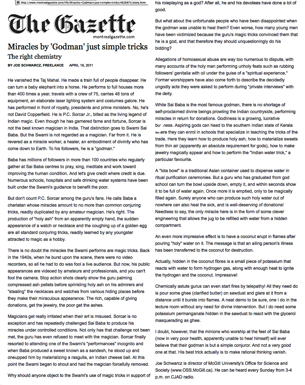 - THE MONTREAL GAZETTE 16/4/2011 Miracles by 'Godman' just simple tricks