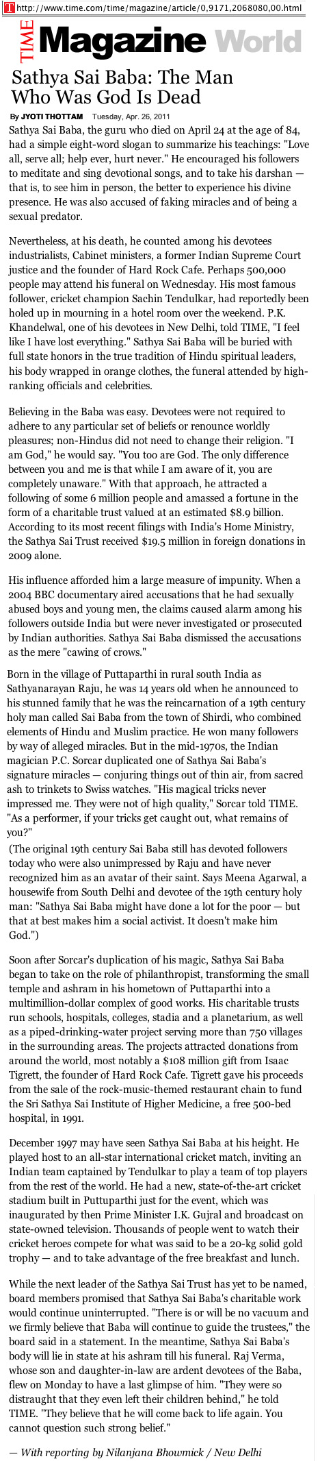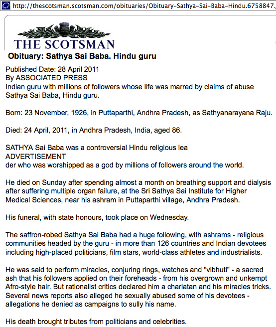 - THE TIMES - OBITUARY OF SAI BABA