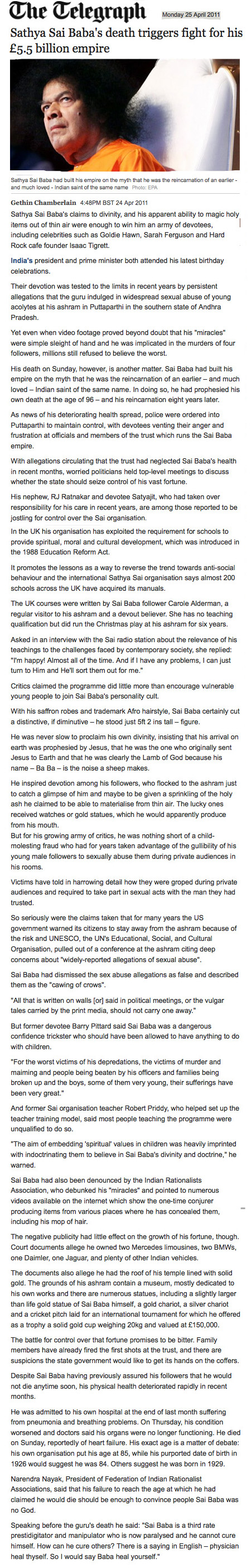 - THE TELEGRAPH OBITUARY - SATHYA SAI BABA - by G. Chamberlain