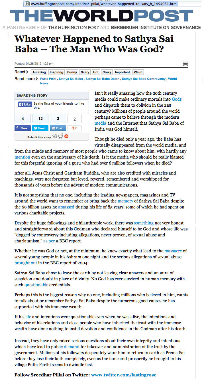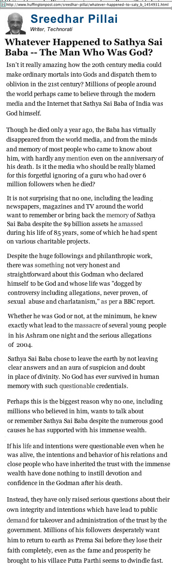 - THE HUFFINGTON POST - Whatever happened to Sai Baba