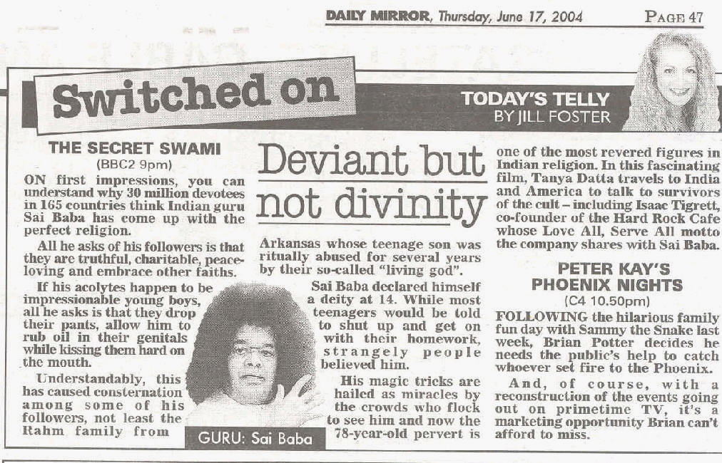 - BRITISH NEWSPAPER REVIEWS OF BBC DOCU. 'THE SECRET SWAMI' The Observer, The Guardian, The Times, The Independent, The Financial Times, The Daily Mirror, Time Out etc...