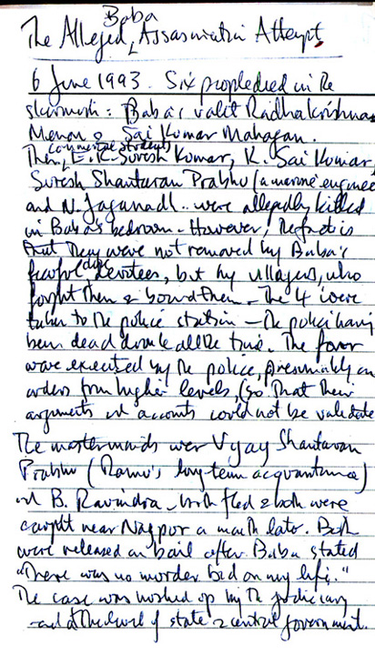 Here is a brief record of some part of the hours of conversations with Ramnath ('Ramu' for short) about the murders, those involved and allied episodes at Prashanti Nilayam. This first raised doubts in my mind about the murder episode, on the basis of which I later questioned V.K. Narasimhan as to their veracity. (Incidentally, I am still also in possession of a very thick bundle of correspondence with Mr. V. Ramnath - about 30 long letters - which may be published from, as and if further cause should arise.)