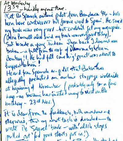 Met the Spanish airline pilot from Brindavan '94 - he's been here continuous but for one visit to Spain. He said my book was very good - but couldn't get any more copies - (Chris Parnell also said my book was very good today). Sat beside a young Indian whose back I learned was broken - a fall from the roof of Dharmakshetra in Bombay! He had felt something 'great' was about to happen to him!