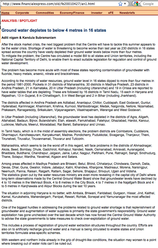 "One of the biggest hurdles in addressing the problems related to ground water shortage is that replenishment of groundwater and augmentation of water supplies is primarily the state government’s responsibility. Ground water exploitation has gone unchecked over the last decade which has now forced the Central Ground Water Authority to advise the state governments to take measures to check over-exploitation of ground water". http://www.financialexpress.com/fe20010427/an1.html