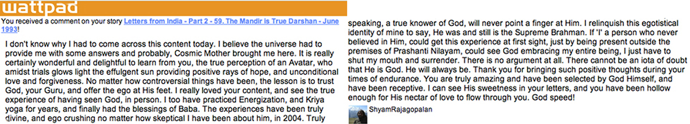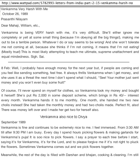 Having read Eileen Weed's accounts of life with Parvatamma, Venkamma and the female side of Sai Baba's family on her Wattpad letters, one must conclude that life with them was far from being one of light, love and 'supreme peace' (Prashanthi), as one would have been led to expect by all the hype in the biographies and accounts put out under Sai Baba's supervision. That Divya was able to countenance this after having been brought up to believe in the highest ideals of Indian spirituality without losing faith in this family and its ruler (SB) is remarkable . To stay and contend with the many most unpleasant challenges and frequent very hard words that were thrown at her by Venkamma, to persist in serving her selflessly and putting up with diverse accusations by this demanding woman, can only be understood on the basis of the indoctrination that all SB followers have to adopt and extend to themselves if they wish to remain aspirants for salvation from all the ills of the world. It says a lot about the tolerant attitude of Eileen Weed, her determination to do good, strength of purpose and truthfulness. These qualities have no doubt been important in her being able to overcome the entire spiritual fraud involved and 'bounce back' without falling into depression or another guru's clutches.
