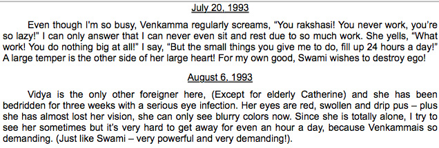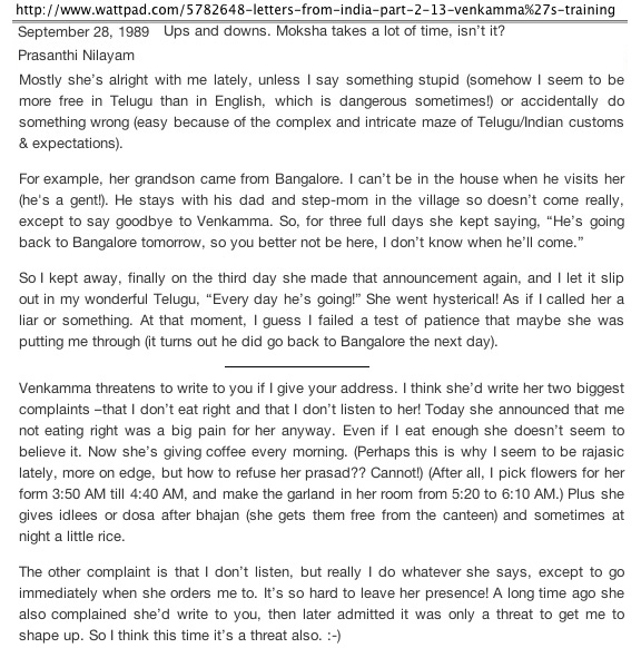All this was from 1987 to 1989 or so. Instead of following sb when he went to Bangalore or traveling, I started to stay in the ashram to continue my seva to Venkamma. Since the ashram threw out everyone, she offered to house me in her room when sb was away. That's how it started me being 24 hours a day in the house, from about 1991 to her death in 1993.