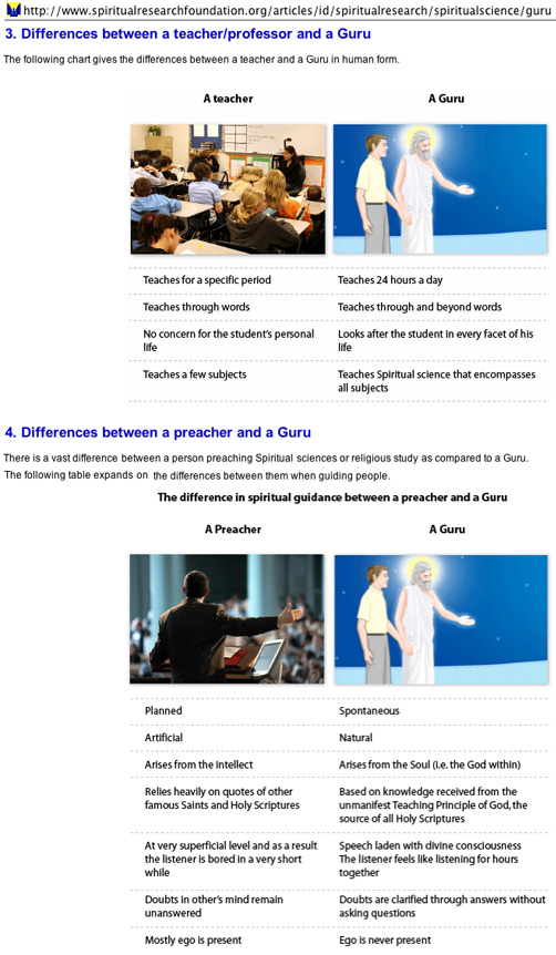 There is an intellectual weakness in following a guru. As the inset scan from the so-called 'spiritual research foundation' we get confirmation that a guru is not considered just to be a teacher, but a ‘spiritual guide’ having pretensions of being more enlightened about life and ‘holy matters’ (i.e. speculative ideas) who tell devotees to distrust their minds and even their sense and trust in faith, the heart (which is just another word for the emotions) and the supposed ‘holy scriptures’. Those who fall for the deception about gurus' stock-in-trade on spiritual superiority can have positive experiences through prejection (conscious and subconscious) onto his person of qualities which create an interaction that can be inspiring becaue of its novelty and new ways of thinking and relating. However,