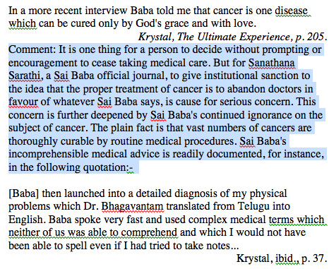 What one can fairly say, perhaps, is that Phyllis Krystal's kind of self-deceit is to protect her faith and all that she has invested her life in for decades. The scan on the right shows how she stretches her credibility to accommodate her faith. This does not condone it, for it covers over a multitude of sins - those of Sathya Sai Baba, whose promises are supposed to be as cast in iron and whose healing is infallible etc. After her husband's death, Mrs. Krystal's house was shattered by the Californian earthquake in the '90s, making her homeless, along with her deceased huband's lifelong collection of crystal glass reportedly worth much more than $1 million. (Odd fixation on crystal/Krystal!). As she describes in detail in her book 'The Ultimate Experience', Sathya Sai Baba had himself told her to move to that house, after she had prayed constantly for a very long time and repeatedly asked him whether she could move house! Eventually he had given the go-ahead verbally to her. Devotees, in their great wisdom, regard such things as a boon from Sathya Sai Baba! A test on which to grow! It helps one to detach from worldly things and prepare for the final detachment! This reasoning, when taken to its conclusion means it is a boon when anything or anyone is destroyed, relatives are lost etc., because it prepares one for death! All very acceptable and faith-inducing, no doubt!