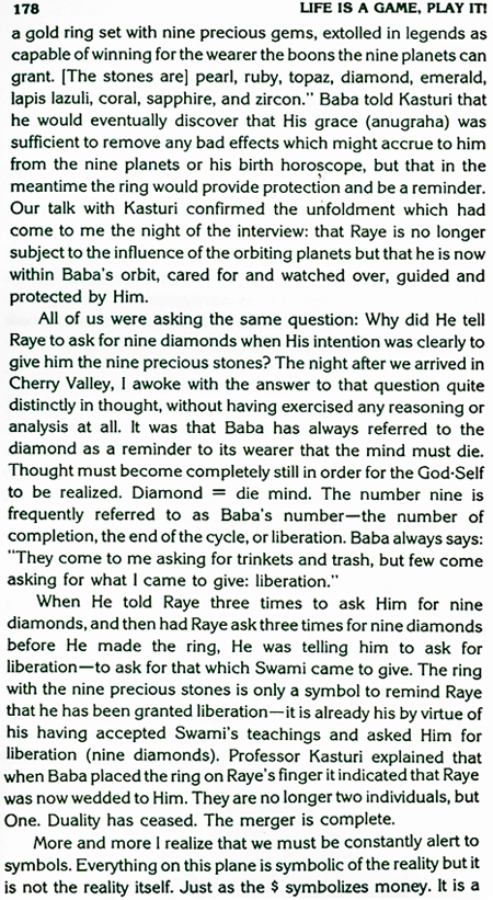 Incidentally, why she carefully avoided other SB statements about life, such as "Life is a prison, all must endure it" (p. 12, Dharma Vahini) , "Life is a game of football: you are the ball" (p. 331 Sathya Sai Speaks Vol. 14),"Life is filled with bondages" (p. 92 Sanathana Sarathi, April 1998) one can but surmise. Her chosen titles are hardly representative of the contents, they are more of a sop to Sai Baba which would increase the chance of him blessing the book. The contents are very much about how Sai Baba affected her in various ways (a lot about herself), details of interviews and his 'teachings' how she found esoteric meanings hidden in his words and acts (invariably far-fetched or quite trivial symbolic interpretations) and how the Sai Baba group centre reacted to Baba, her stories and opinions. The books always had numerous photos of herself and Raye with Sai Baba, receiving blessings of various kinds - book signings, vibuthi 'production' and so forth .Further down here, I select two excerpts from 'Life is a Game, Play It' which are representative of her written materials.