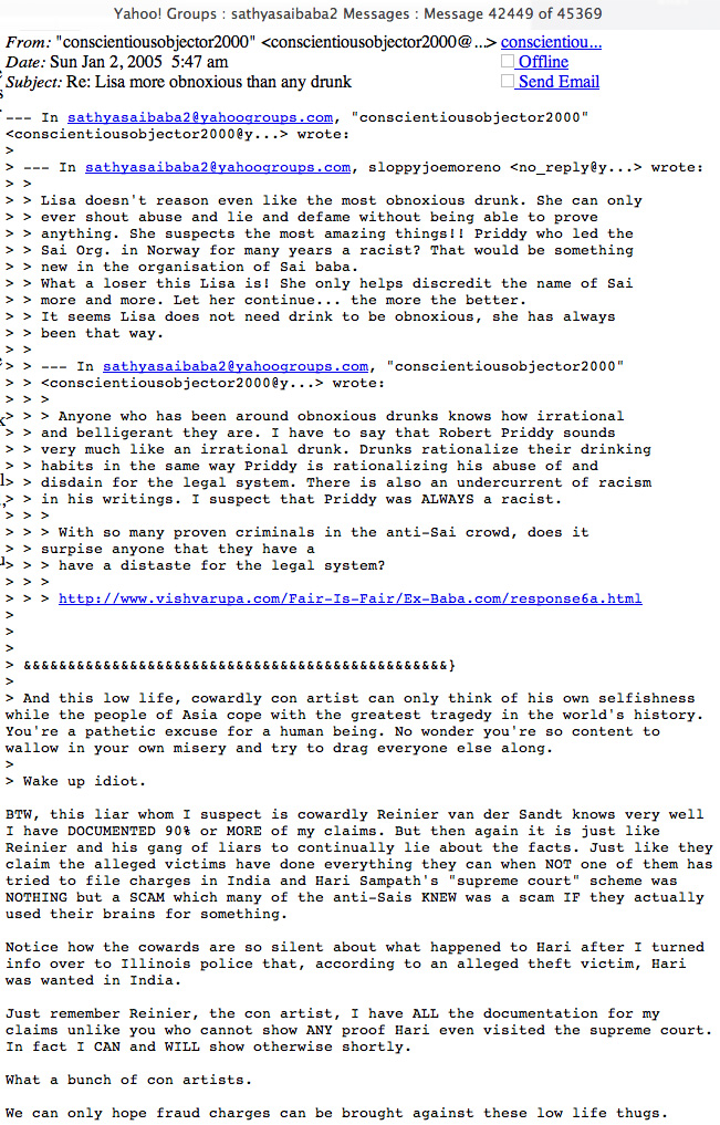 A very large number of Sai followers have posted untrue and libelous statements about the exposé and its many contributors on Yahoo groups, bulletin boards, and as comments on websites and blogs. Many hundreds of abusive e-mails have been received. The overwhelming majority of all these devotees employ anonymity, hiding behind bogus names and using cloaked IPs. In time, a selection of this massive dossier will be posted here if only to illustrate the level of mentality of those who take to the internet to try to defend Sathya Sai Baba and cause mischief and confusion about established facts and documented words.