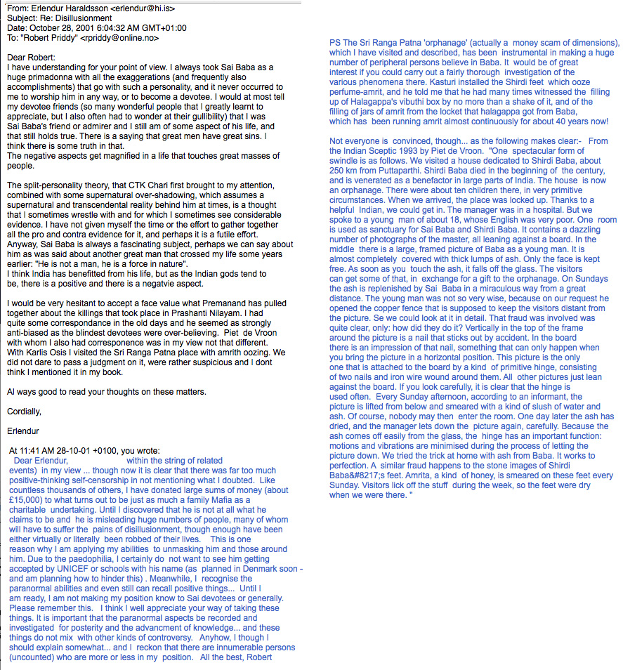 Haraldsson was antagonistic towards the famous Indian skeptic Basava Premanand because he had been questioned him in e-mails he posted about certain failures in his investigation technique. H. eventually ceased to reply to his pertinent questions. However, Premanand's massive tome on the Murders in Sai Baba's Bedroom contains very extensive documentation of many aspects of the murders, the corrupt investigation process by police, CBI and nearly one hundred press reports. There can be no doubt whatever that Premanand was correct in most of his central contentions, if misled on less central issues now and again. That Sathya Sai Baba gave the order to shoot the four bound assailants can hardly be doubted any longer, especially since eye-witness accounts support this most strongly... one of which was a US devotee living in the apartment of Sai Baba's sister Venkamma at the time. This person, since disaffected, described the situation and especially how Sai Baba sent wads of money Rs. 60,000.- to Venkamma and to every relative of Sai Baba there and other insider residents the morning after the murders!