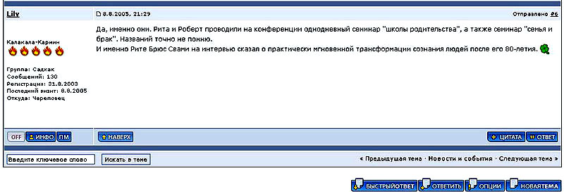 "At the conference Rita and Robert conducted a one-day workshop of 'parenting school' and a workshop on 'family and marriage'. I don't recall exact titles. And it was Rita Bruce whom Swami told about practically instant transformation of people's consciousness after his 80th anniversary."