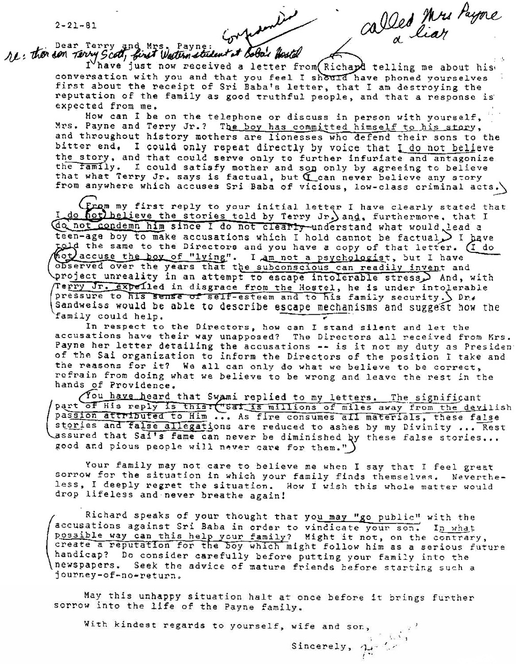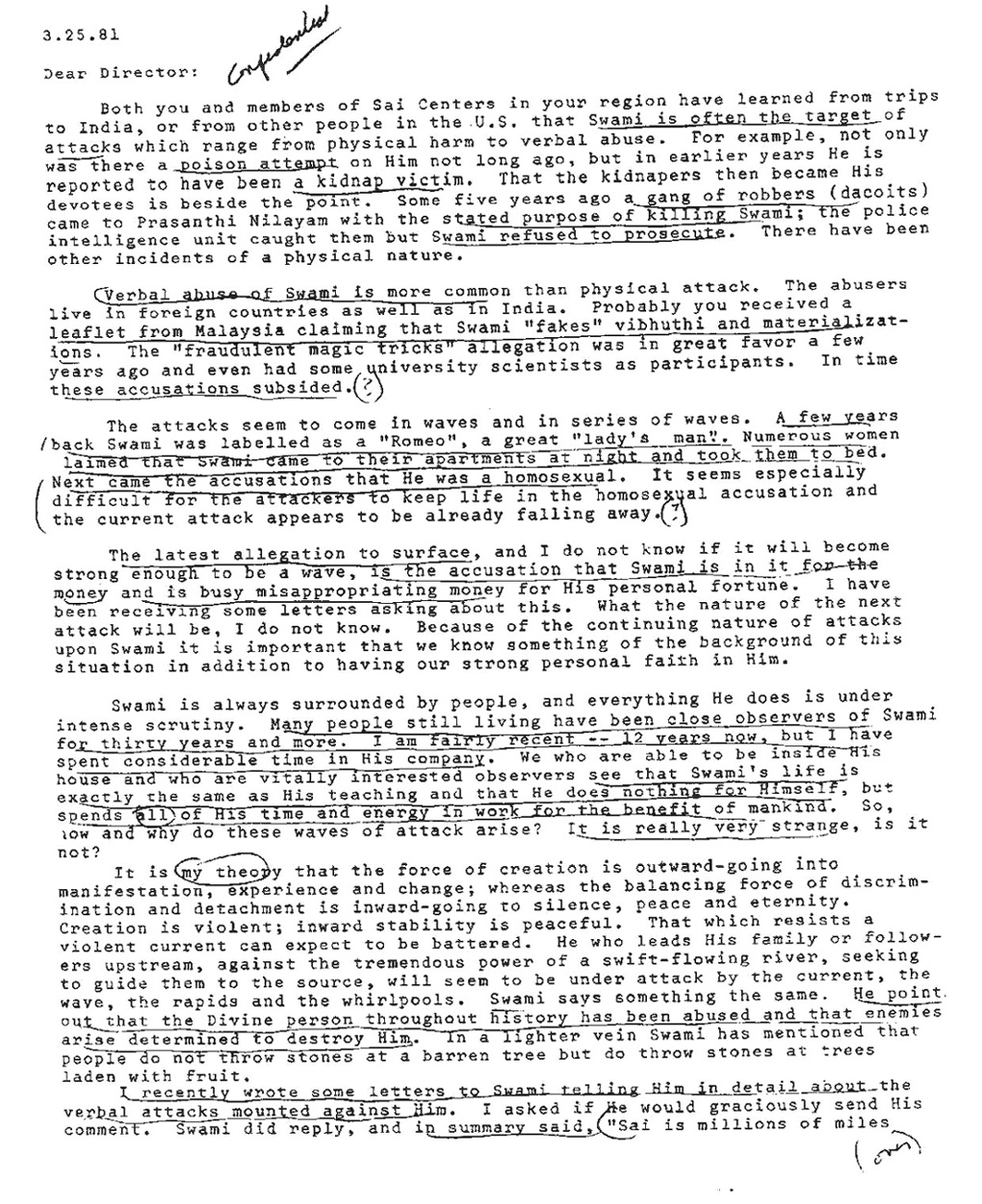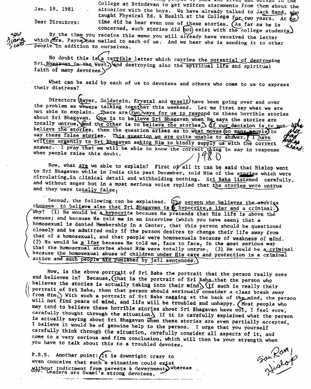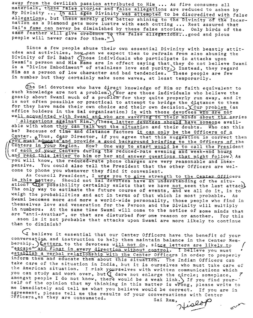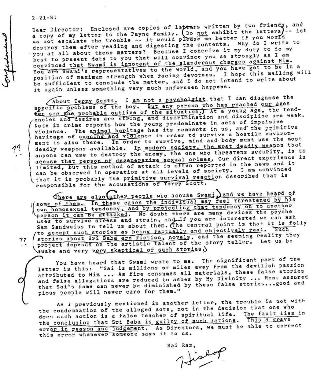 | 2-21-81 (see scan of original xerox circular from Hislop) Dear Director: Enclosed are copies of letters written by two friends, and a copy of my letter to the X family. Do not exhibit the letters – let us not escalate the trouble – it would please me better if you would destroy them after reading and digesting the contents. Why do I write to you at all about these matters? Because I conceive it my duty to do my best to present data to you that will convince you as strongly as I am convinced that Swami is innocent of the slanderous charges against Him. You are Swami’s representatives to the world, and you have got to be in a position of maximum strength when facing devotees. I hope this mailing will be sufficient to conclude the matter, and I do not intend to write about it again unless something very much unforeseen happens. About X. I am not a psychologist that I can diagnose the specific problems of the boy. But any person who has reached our ages can see the probable outline of the situation. At a young age, the tendencies and desires are strong, and discrimination and discipline are weak. Note in crime reports how the young predominate in acts of impulsive violence. The animal heritage has its remnants in us, and the primitive heritage of cunning and violence in order to survive a hostile environment is also there. In order to survive, mind and body must use the most deadly weapons available. In modern society, the most deadly weapon that anyone can use to destroy the enemy, the one who threatens security, is to accuse that person of degenerative sexual crimes. Our direct experience is limited, but this method of attack is often reported in the news and it can be observed in operation at all levels of society. I am convinced that it is probably the primitive survival reaction described that is responsible for the accusations of X. There are also other people who accuse Swami, and we have heard of some of them. In these cases the individual may feel threatened by his own homosexual tendency, and by projecting that tendency on to another person it can be attacked. No doubt there are many devices the psyche uses to survive stress and strain, and if you are interested we can ask Sam Sandweiss to tell us about them. The central point is that it is folly to accept such stories as being factually and objectively real. Such stories about Sri Baba are fiction, novels, and the seeming reality they project depends on the artistic talent of the story teller. Let us be awake and very very skeptical of such stories. You have heard that Swami wrote to me. The significant part of the letter is this: “Sai is millions of miles away from the devilish passion attributed to Him … As fire consumes all materials, these false stories and false allegations are reduced to ashes by My Divinity … Rest assures that Sai’s fame can never be diminished by these false stories … good and pious people will never care for them.” As I previously mentioned in another letter, the trouble is not with the condemnation of the alleged acts, not in the decision that one who does such action is a false teacher of spiritual life. The fault lies in the conclusion that Sri Baba is guilty of such actions. This a grave error in reason and judgement. As Directors, we must be able to correct this error whenever someone says it to us. Sai Ram, Hislop |