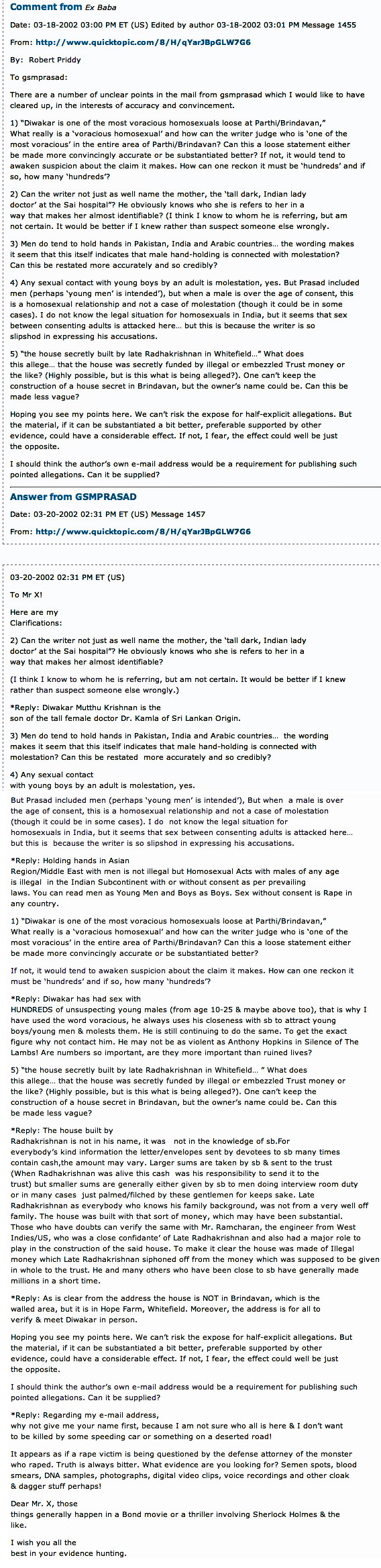 A former Sathya Sai Baba college student, GSM Prasad, posted a number of entries on the former Quick Topic website which has since been removed. These were reposted in several languages on the Polish on sekty.net (now defunct but see scans of English pages below) and also on http://exbaba.com here. The fact that the true identity of GSM Prasad is not revealed itself reveals is that no former student of Sathya Sai Baba who speaks out about being assaulted sexually by him is safe from reprisal. It is, of course, well known that four of his devoted students were executed by the police in Sathya Sai Baba’s bedroom in a hail of bullets in June 1993. That is what is most revealing in respect of the need for anonymity. However, GSM Prasad was avilable by e-mail and I investigated further some of the issues here (see later)