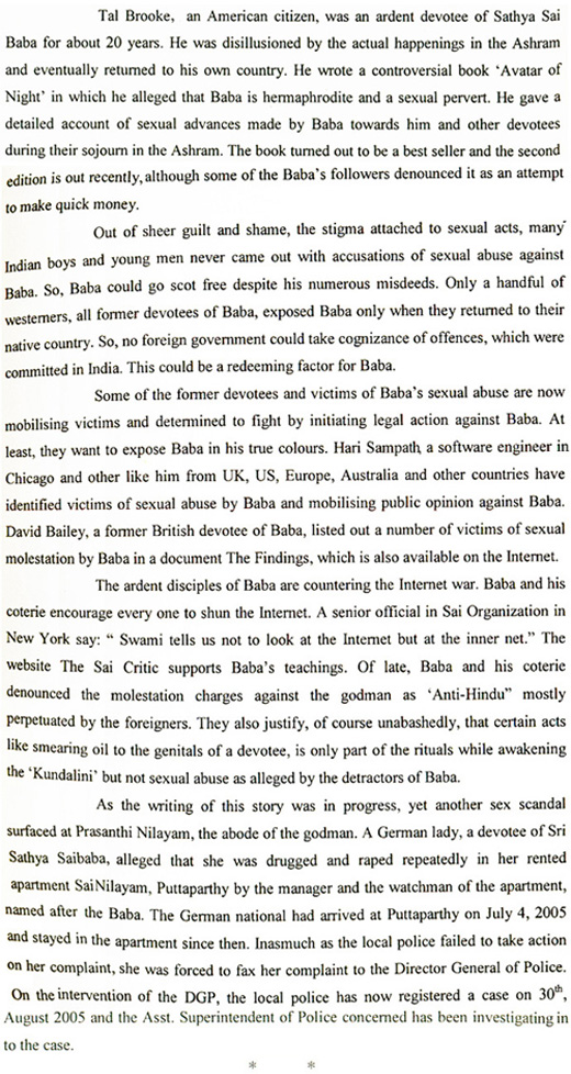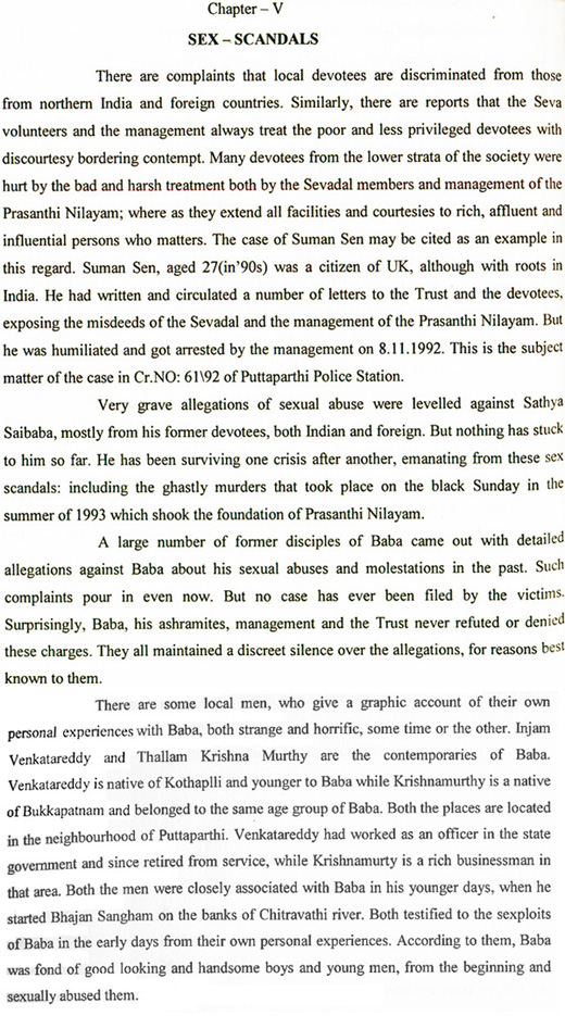 The Indian CID official, J. Ram, who was awarded the President's Police Medal for intensive and successful sleuthing reported on the scandals surrounding sex abuses by Sathya Sai Baba in his book 'The Godmen of India', 2005:-