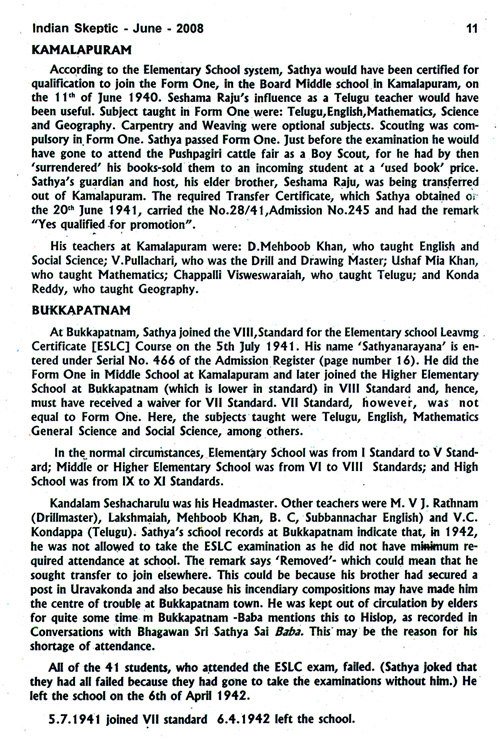 | saibabaexpose.wordpress.com remarked:- “A major problem in trying to understand Sathya Sai Baba’s life relates to relying heavily on ‘official’ material, such as the authorized ‘Sathyam Sivam Sundaram’ hagiography by N. Kasturi, whose authenticity and reliability have come under serious scrutiny. A common misconception relating to the young Sai Baba (as Sathyanarayana Raju) is the assumption of his continuance of education in nearby Bukkapatnam, all because it happens to be the neighbouring town. Meticulous research by way of analyzing all of Raju’s available school records show his education movements as follows:- Puttaparthi – Kamalapuram – Bukkapatnam – Uravakonda The reason given to account for such upheaval relates to how Raju’s parents entrusted the responsibility of his education to their eldest son, Seshama, who was a teacher by occupation and was himself frequently transferred around the district to teach. Consequently Raju followed his brother and lived in the same house along with him, his sister-in-law and her relatives. And so Raju was transferred from the Government-aided Elementary School in Puttaparthi to the Board Middle School in Kamalapuram. Thanks to Seshama’s disruptive transfers, he was transferred from there to the Samithi Elementary School at Bukkapatnam. • Text on left of certificate reads:- • Name of the school which the pupil is leaving: B.M. School Kamalapuram • Name of the pupil: Ratnakaram Satyanarayana • Date of birth as entered in the admission register: 4.10.1929 (Fourth October Nineteen Twenty Nine) • Class or form in which the pupil was [unintelligible] at the time of leaving (in words): First Form • Date of admission or promotion to that class or form: 11.6.40 • Date when the pupil actually left the school: 22.4.41 • Date on which application for transfer certificate was made on behalf of the pupil by the parent or guardian: 20.6.41 • Date of transfer certificate: 20.6.41″ |