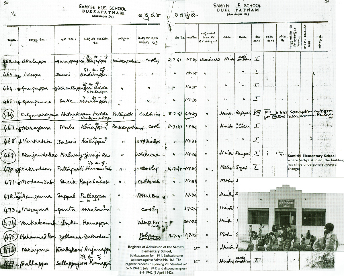 "Sathya's date of birth in school records, however, is recorded as the 4"” of October l929-and not the traditionally recognised date of the 23"’ of November I926. Talipineni Kesappa. son of Talipineni Ramappa maintains that Sathya was one year senior to him at school: therefore. Kesappa's date of birth being the I l"‘ of June I927. Sathya's year of birth definitely is I926. It has long been a practice in the schools to record a date of birth as being much later than the ‘actual’ date of birth-in order to facilitate career prospects. Sathya's parents wanted Sathya to become an educated officer. This. possibly. could be the reason for the discrepancy. In addition. in I926. people in remote villages like Puttaparthi. in pre-independent India. were not very particular about dates and birth registration was done much later." (View school register)