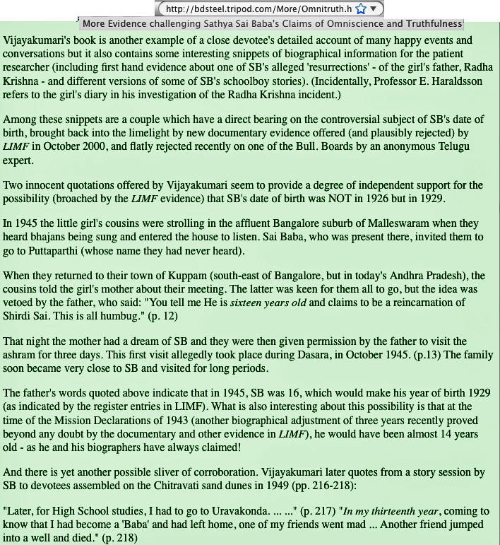 "Although the editors of LIMF are at pains (on p. 149) to deny that the 3 year discrepancy in the new date for the Declaration is of any importance, their argument is unconvincing: "Indian spirituality tends to discourage numerous debates on scholarly details relating to time and space. Sri Sathya Sai Baba also disapproves of such debates. ..." (see more at http://bdsteel.tripod.com/More/Omnitruth.htm also Specific Discrepancies in the Official SSB Biography and here below:-
