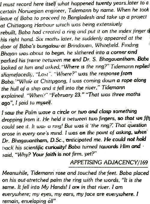 Tidemann's story of ring lost in Ganges returned by Sai Baba (accordng to N. Kasturi)