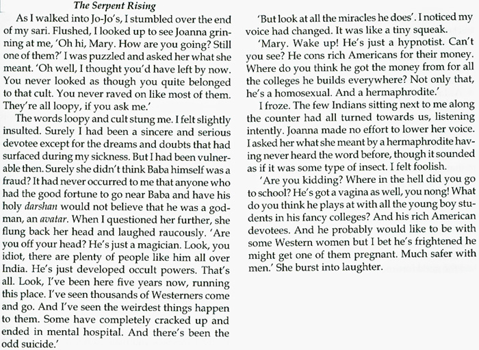 The Australian author Mary Garden, who was at Brindavan for many months in late 70s, wrote in her book 'The Serpent Rising' how she visited Brindavan and what she experienced with Sai Baba there. The experience turned very negative until she met a US lady called Joanna who had a restaurant who told her about Sai Baba's fraud and homosexuality (excerpt follows):-