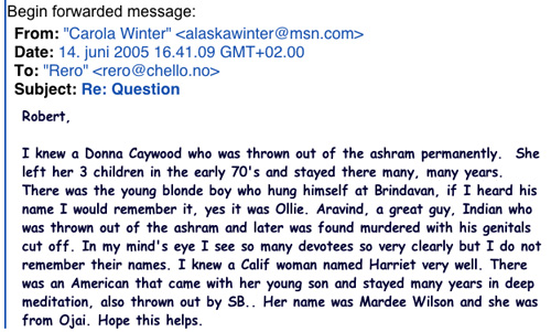 Feb 4, 2004 from KarK to Mary "Now I have changed my mind again about Sai Baba and think he is a Demon. He has gone way too far with his games and antics and his vicious manipulations of Indian culture and religion. Besides I had a dream that explained to me very clearly that he is doing all of these things that people say he is doing. So, after taking a break from all of the very depressing Sai Baba files, I went back and started reading them again. The Quicktopic files discussed by the Sai students and Barry Pittard's long letter are really excellent. In those files are lots of new Internet addresses that go deeper into Sai Baba as a phenomenon. Highly recommend it as good reading. Now I, too, feel that things might get done. If these students keep at it with confidence, they might be very surprised how successful they might actually be in the Sai Baba community at large. To Mary Garden from KarK… addition on Arvind:-"He had his stomach cut out while he was sleeping and they found him still alive in the morning. Sai Baba did not do a thing to assist anybody in the investigation. There were other "deaths' in Bangalore and nothing was done about this either." Apl. 6 - 2004 from KarK to Mary on her new visit to India: "I can't say that Sai Baba didn't hurt me; he did, but it was not a physical violation that is purported to be going on now. Also, I did not know he is gay or I probably would have gotten back on the road and gone to Malaysia ." to Barry Pittard from KarK 6 Nov. 2004 "I saw the BBC Docudrama and think it is a real good start. Some of the issues have to be picked up again and again until you start to uncover some of the things that are hidden; casual conversation for the TV probably will not reveal very much, but will expose some people to the public."