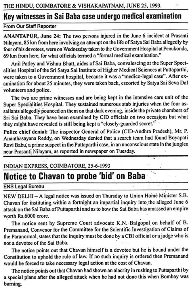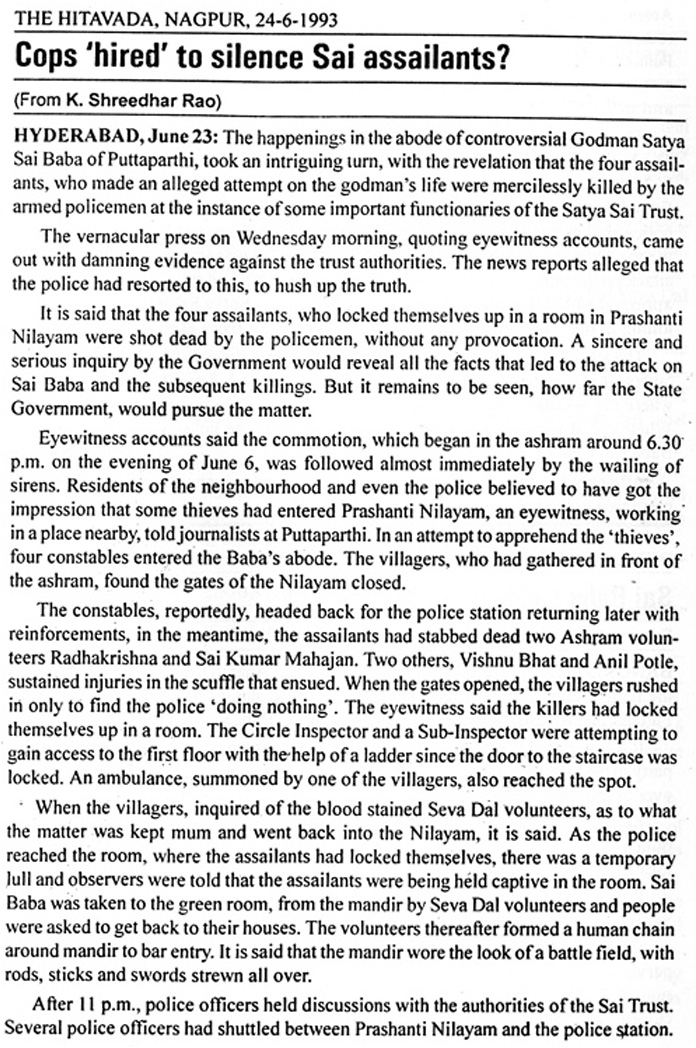 Shock, disbelief from staunch devotees: Kin of Baba's assailants call for thorough probe into police action. Deccan Herald Bangalore June 6, 1993.