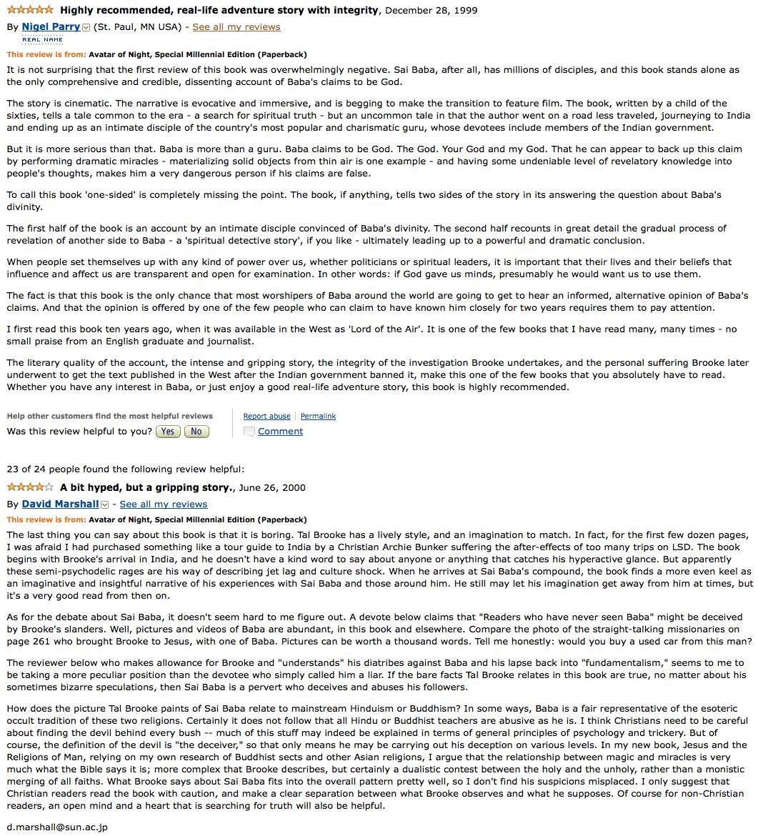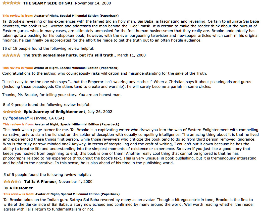 Tal Brooke first published his main exposé book on Sathya Sai Baba under the title 'Avatar of Night - The Hidden Side of Sai Baba'. in 1982, Tamang Paperbacks ISBN 0-7069-1483-X) It was the earliest published account in English of Sathya Sai Baba's sexual molestations. Sai Baba's people apparently bought up every copy in India as soon as possible to destroy them, so it became unavailable very soon. It was republished under various titles abroad (see book list). Sathya Sai Baba Brooke was one of the earliest western devotees who came very close to Sai Baba, the trials and tribulations of which he tells. Many months at the ashram following what he thought to be a supreme spiritual master and avatar turned eventually into a living nightmare, not only did he discover dark sides to Sai baba - including sexual abnormalities ain reported abuses of young men, but an increasing condition of mental stress and physical weakening, the latter due to the cheap but unnourishing food from the ashram canteens.