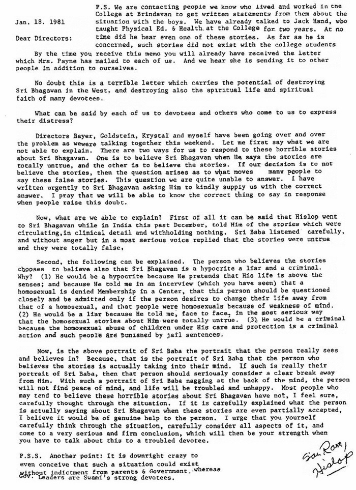 letters, sent by Dr. John Hislop (President of the US Sai Org.) only to