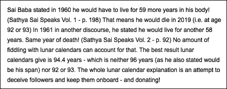 The purpose of this site is to inform the public about a number of disconcerting reports that must be painful to many of Sai Baba's devotees. For some time now a lot of information in English is to be found on the web referring to his sexual dealings with male devotees of ages ranging from seven to thirty.