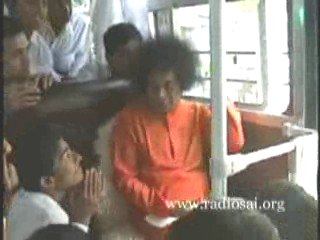 Darshan Background Bhajan Shambo Shiva Shankara in Puttaparthi, in this occasion we see Baba right from the beginning getting something with his right hand from the left hand, at the end only two fingers finally fetch the small item, which is of course a vibhuti pellet that will be crushed but delivered as a miracle to a male student moments later.