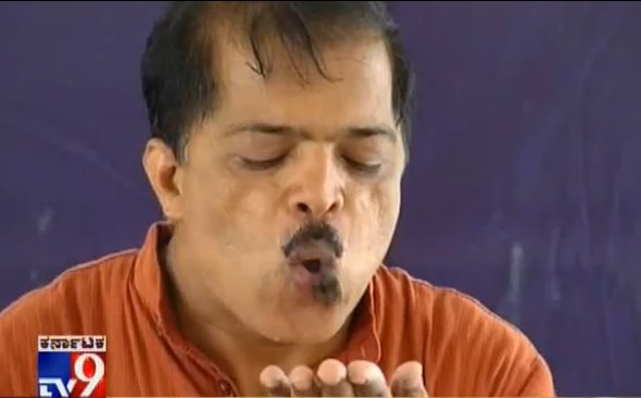 Sai Baba allowed an unprecedented live broadcast in the Indian subcontinent of his so-called 'lingodbhava' (bringing the egg-like ellipsoidal object out of his mouth after what looks like a painful process of 'regurgitation'). However, one can most clearly see that NO lingam actually emerged at all, view the most important fragment of the clip in slow motion this year. Instead there was a small spurt of yellowish vomit, which was later claimed to be the lingam in liquid golden form!