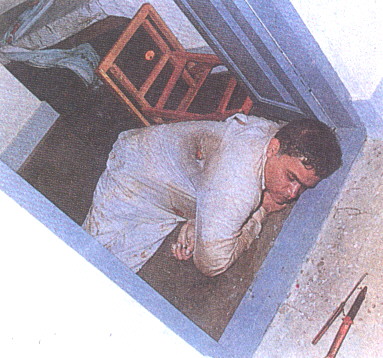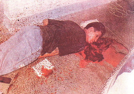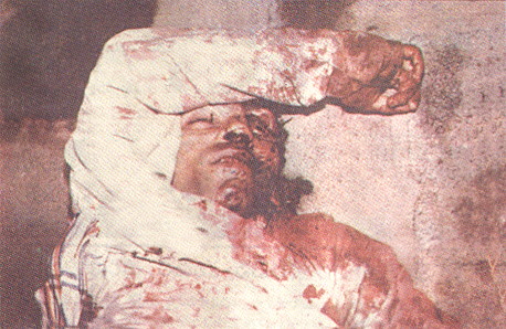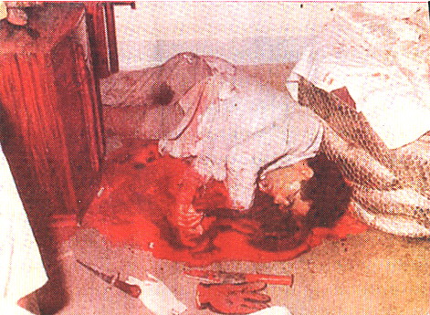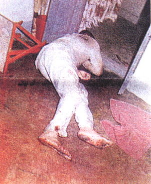 In Pic. 25 and 27 you can see his feet in the space of a wooden almirah. This very clearly proves that he had not dashed out of Baba's bedroom to stab the police and really he was shot while hiding behind the alnurah. He was shot in the left eye and the brain was lacerated, the 2nd shot was on the right thigh and the 3rd shot in the lateral side of the left wrist. All shots were from less than 6"distance. There is a blood pool around him down the waist and not beyond the thigh. Though the 2nd shot was on the right thigh, there is no blood on the right side of the pants. Both the hands are with blood but the blood had not splashed around after the fall. The two knifes are clean at the handle and the one near to him, the blade has blood stains. There are two gloves near him one as if dipped in blood and the other spotless. When he would have died immediately he was shot in the eye there would not have been any time to remove the gloves after having been shot on the left wrist. There is also a part of white cloth touching the red gloves without any blood on it. His shirt and pants are almost spotless. In photographs 25, 26, 27 he has fallen on his left side. The photograph 28 shows him fallen on his back and the hands are not in the same position as in other 3 photographs 25, 26, 27.