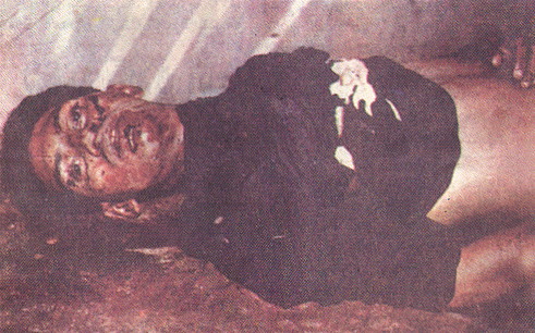 In Photograph 17 there is a rope above his head in the corner of the room. The eyes are closed in photograph 16, 17, 18, while in photograph 19 it is wide open. Someone has raised his shirt and his stomach part is seen with his left hand on it. His mouth is open and everything looks unnatural.