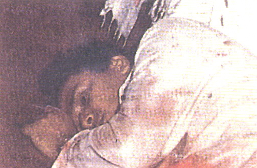 Pic. 12 shows Suresh Shantharam Prabhu with his head on the door step. In the l3th photograph taken from his back, his legs are in the middle of the room and there is a pink colored bath towel on his right side. At his back on the left is a fallen teapot. In the l2th and l3th photographs the position of the legs of the teapot is different. Moreover if the teapot was really there it would not have been possible to open the door. If the assailant had come out of the door to stab the police, he would not have been shot inside the center of the room, from the back. There is not a drop of blood on the floor when he had been shot at less than 6"distance at the back of the right chest. The position of the body in Pic. 12 and 13 shows that he was shot from behind from the room. When the four alleged assailants were shot dead at less than 6"distance, what was the necessity of 5 police shooting them is not known. Moreover the bullets which have pierced them have not been checked as to from which rifles they were shot.