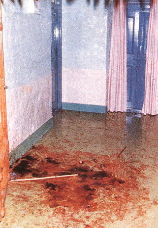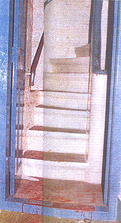 Pic. 5 the staircase with doors open. While there are no foot prints in blood on the floor after the door; surprisingly blood is seen sprinkled on the steps and 3 streamlets of blood flowing up to the floor on the door steps. This is unnatural and the police have not explained how the blood suddenly appeared on the door steps and the stairs. They also do not look like the foot prints of blood of the four assailants. So if it was true that the four assailants had indiscriminately stabbed the four aides, their foot prints in blood would have been seen surely on the floor and the stairs or where ever they walked. Also when the door to the stairs is seen closed in Pic. 6 it is strange that the blood has splashed on the stairs.
