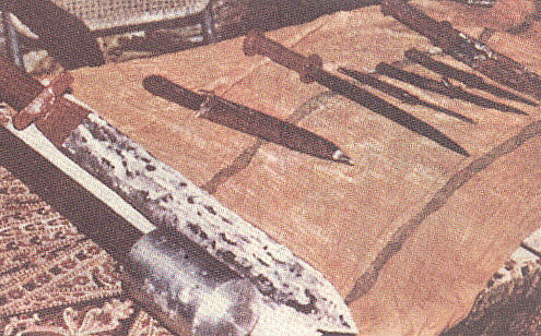 Pic. 6 shows seven knives one as long as 4' long. It is not known how these could be hidden in their body by the four alleged assailants when blood stains are seen especially on the 4' sword and the metal instrument. They were not found near the bodies of the four assailants.