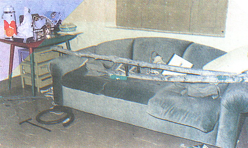 Pic. 7 is the interview room of Sai Baba next to his bedroom where Sai Baba meets the members of his trust and other functionaries. There are two wooden poles, one stained with blood, a pillow with blood stain, a wall clock, a table lamp and other articles on the sofa. But no blood on the sofa. The very fact that these materials are on the sofa set proves someone had placed them on the sofa. This proves that there were others in Sai Baba residence. On the left side of the sofa near the teapot there is rope and a stick. In front of the sofa on the left side is a hose and a T-shaped metal instrument.