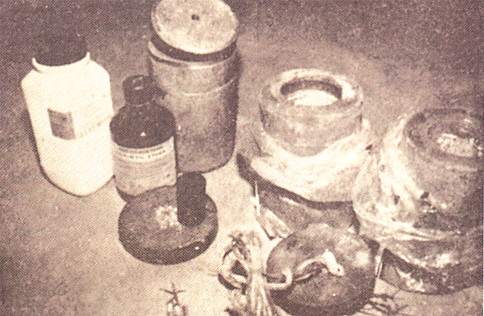 Pic. 8 is of the 2 bottles containing potassium cyanide and ether and the rest are the defused bomb parts with wire etc. The police have not explained how after a thorough search of the premises on 7th, they discovered the bombs on 8.6.1993. Also because of the visit of president's family and home minister the whole complex would have been searched by the intelligence department as per the protocol. When the bombs were not found then, it proves beyond doubt that the bombs were planted after the murders to make the murder case strong.