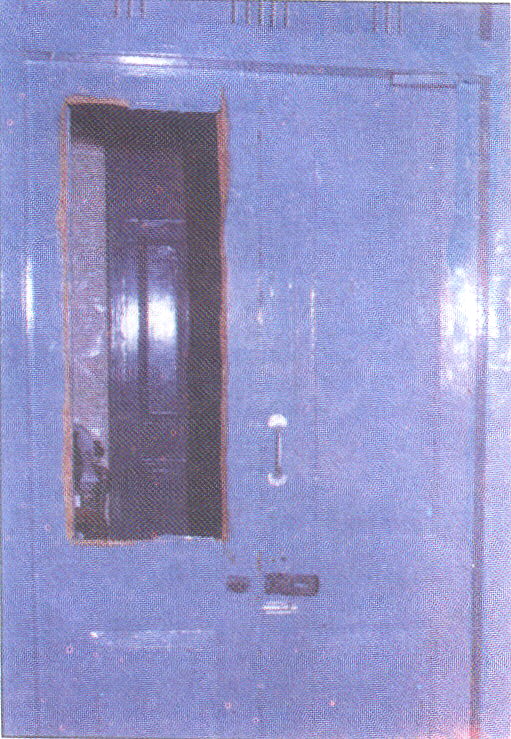Pic. 9 is the door to Sai Baba's bedroom. It is alleged in the F.I.R. that the police broke open the top left side blank to open the door. Photographs 17, 18, 19, 26, 27 and 28 taken from inside and outside Baba's bedroom do not show the broken pieces of the plank except a small blue colored piece near the back of Sai Ram in Pic.16. 1f the door plank was broken before the shooting, the pieces ought to have been found inside and outside of the bedroom. The photograph 9 shows the plank was neatly removed. There is  no proof that the police broke open the plank in which case the plank pieces ought to have been seen in the above photographs.