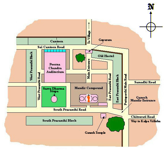 Prasanthi Nilayam Complex The image is a clickable map, click on a location to see a picture or to read some details about the place.