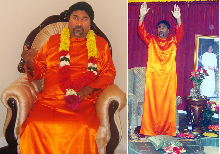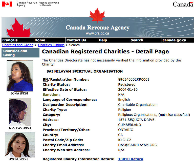 Name Dharamraj Singh – Date of birth: 23-Sep-53: Canadian citizen. Growing up in Guyana Dharamraj was then called Sugrim by his family. At birth he was taken away by his paternal grandmother until the age of 7. In the critical years of a child’s life he was not provided nurture from his own mother. He already considered himself the chosen one nonetheless, which indicates a serious pathological disturbance already developing. He moved to Canada and became naturalized, and is presently – besides dispensing God’s favour – is listed professionally as: Singh, Ram; Senior Policy and Program Analyst, and he is a full-time government employee! (e-mails to Ram: Ram.Singh@tbs-sct.gc.ca – e-mail for devotees: Sugriv/Ram: singh.ram@tbs-sct.gc.ca). Within his organization (Sai Nilayam Spiritual Organisation) Dharamaraj Singh and his wife never use their real/legal names. He is known there as Sugriv, Sugreev, or Sugrim and the names he uses to address himself and expects his devotees to use are “GOD”: Swami, Baba, Sathya Sai Baba, Satya Sai Baba, Sai Baba. His wife is known as ‘Das’. His wife and two daughters – Simone and Sonia are directors of this profitable outfit.