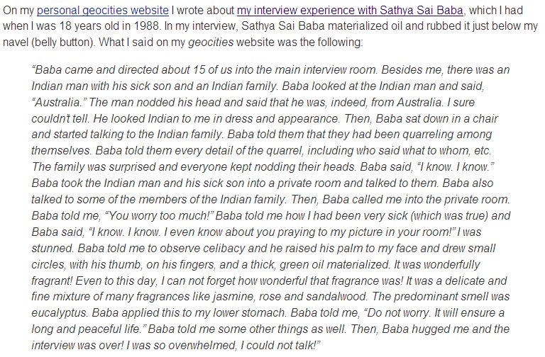 Important are these words Priddy writes: 'Moreno did not perceive it as such, but few who go into the private room behind closed doors believing Sathya Sai Baba to be a divinity seldom do.